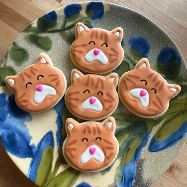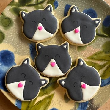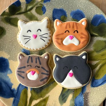 Deliciously soft sugar cookies with royal icing details. Basic designs are one shape per half dozen and up to 2 colors (not including white). These cookies typically have a simple design. Most custom cat cookies fall into this tier.